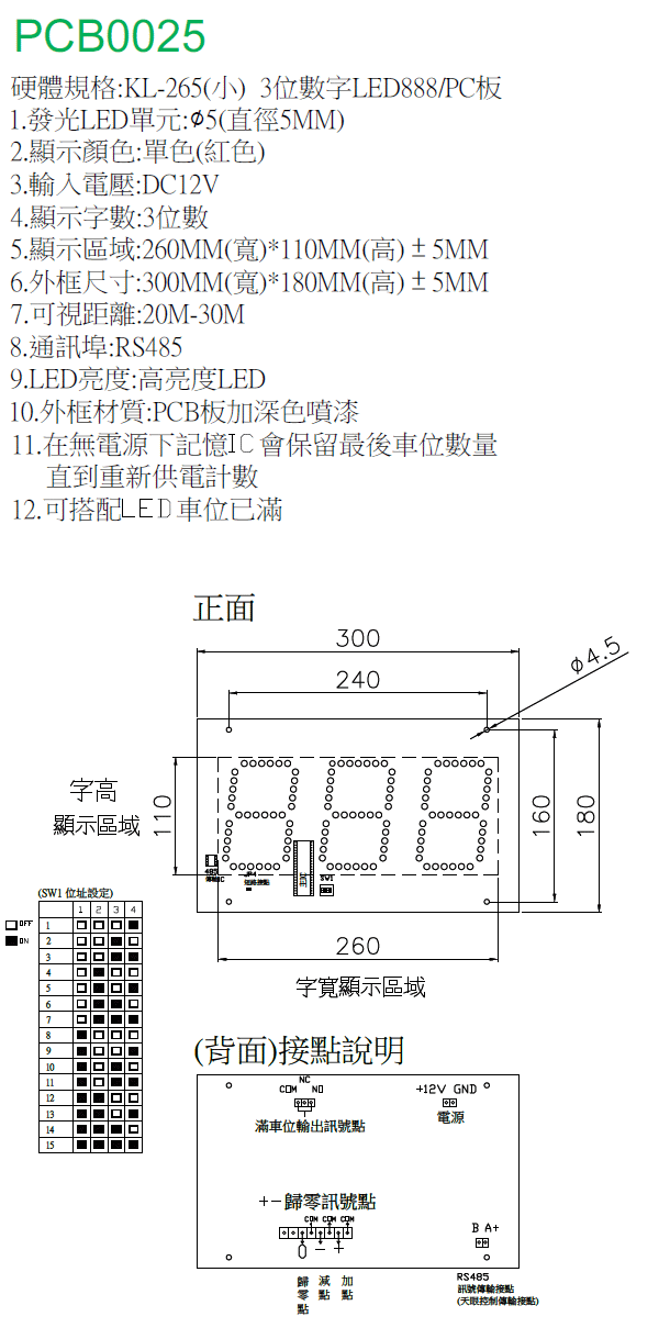 3位 888 LED 計數燈 (Model : KL-260 / KL-265) 3位數字LED888/PC板,外框材質為PCB板加黑色噴漆,可視距離20M-30M, 有兩種型號,大型為KL260,重量約830克,小型為KL265,重量約240克,詳細規格可參照下面詳細介紹